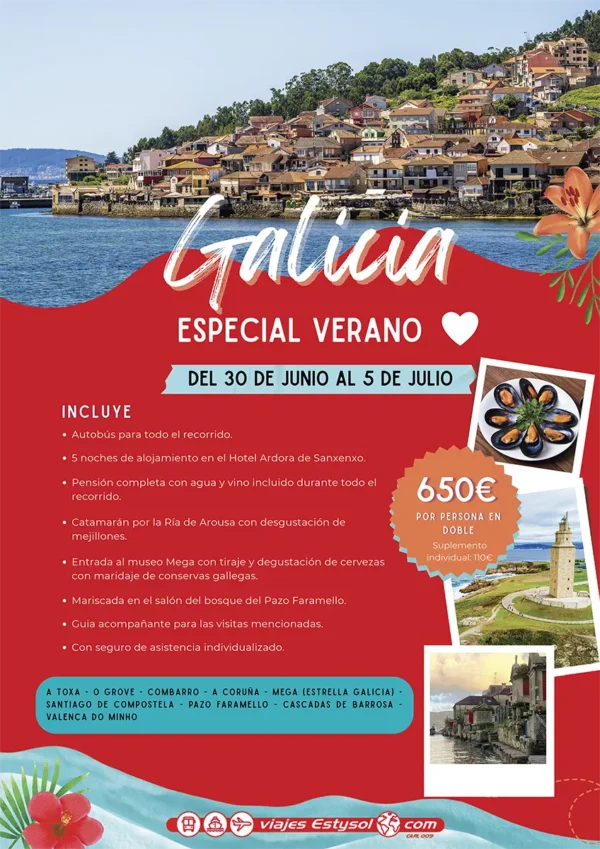 Viaje a Galicia del 7 al 12 de octubre de 2026 Precio: 580€ por persona. Suplemento Individual: 110€ EL PRECIO INCLUYE Autobús para todo el recorrido cumpliendo tacógrafo. 5 noches en el hotel Ardora de Sanxenxo. Pensión completa durante todo el recorido con agua y vino incluido. Catamarán por la Ría de Arousa con degustación…