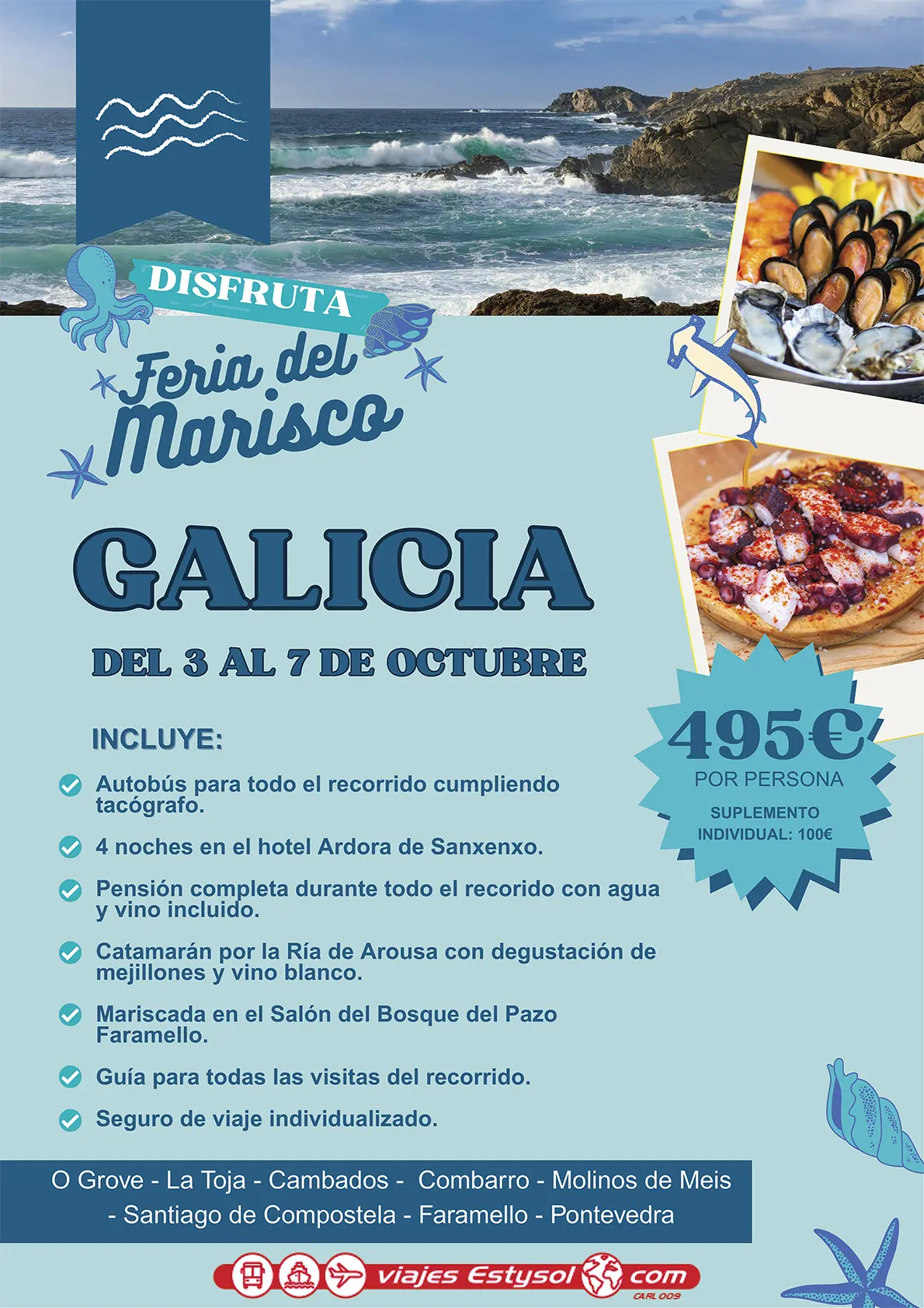 Viaje a Galicia del 7 al 12 de octubre de 2026 Precio: 580€ por persona. Suplemento Individual: 110€ EL PRECIO INCLUYE Autobús para todo el recorrido cumpliendo tacógrafo. 5 noches en el hotel Ardora de Sanxenxo. Pensión completa durante todo el recorido con agua y vino incluido. Catamarán por la Ría de Arousa con degustación…